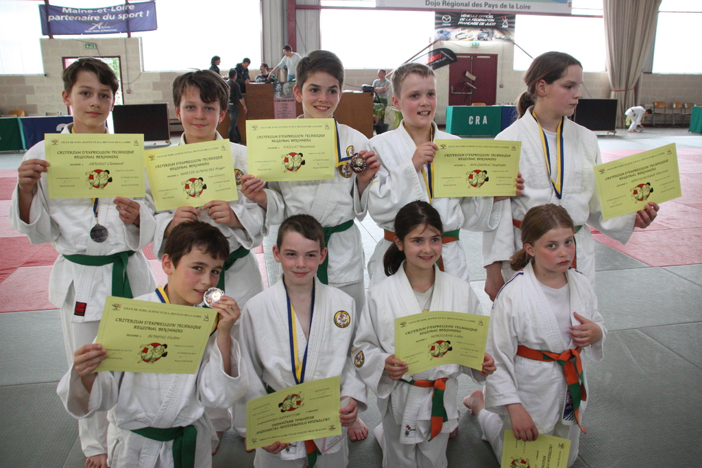 Après leur moisson de médailles lors du criterium technique départemental, nos benjamin(e)s ont réitéré l'exploit au niveau régional ce dimanche 5 juin. Il s'agissait toujours de présenter des démonstrations devant un jury de professeurs de la ligue. Au programme : démonstrations de chutes et de techniques de projections, Yaku Soku Geiko au sol et debout. Le Judo Club Montreuil Juigné s'est particulièrement distingué en plaçant 4 couples sur les podiums. Dans la catégorie des ceintures vertes, Hugo MARTIN KOWALSKI et Clément ARNAUD sont 2ème tandis que Maxence VALLAT et Victor BOMPAS sont 4ème. Dans la catégorie des ceintures orangse-vertes, Marine GENTILHOMME et Baptiste BOCQUERAZ sont 3ème. Ugo OGER TESSIER et Alexandre BELLANGER sont 4ème tandis que Camille CLEMENT et Lola MORILLEAU sont 6ème. Un joli palmarès qui vient clôturer en beauté une saison formidable de nos jeunes benjamins. Félicitations à eux !!!