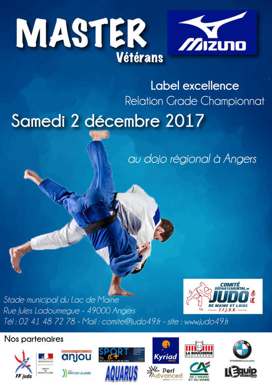 Samedi 2 décembre 2017, plus de 400 judokas de toute la France était réunis à Angers pour le Masters national Vétérans devenu cette année le « Master Mizuno ». Il s’agit d’une compétition pour les plus de 30 ans qui combattent par catégorie d’âges. 3 judokas du club représentaient Montreuil-Juigné. Rémy BOURRIGAULT s’est classé 5ème en M2 -60kg et Etienne HENRY 5ème en M4 -90kg. Marie-Thérèse VLAMINCK, 69 ans et doyenne de la compétition, représentait également le JCMJ. Elle a combattue en -52kg contre des judokas plus jeunes et s’est classée 3ème . Félicitations à Marie-Thé pour cette belle leçon de vie !!!